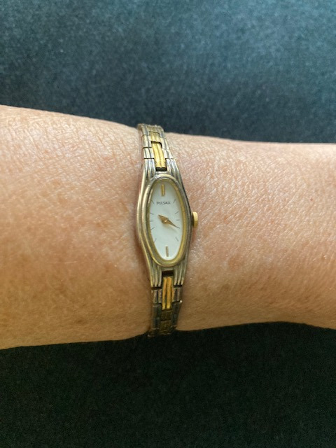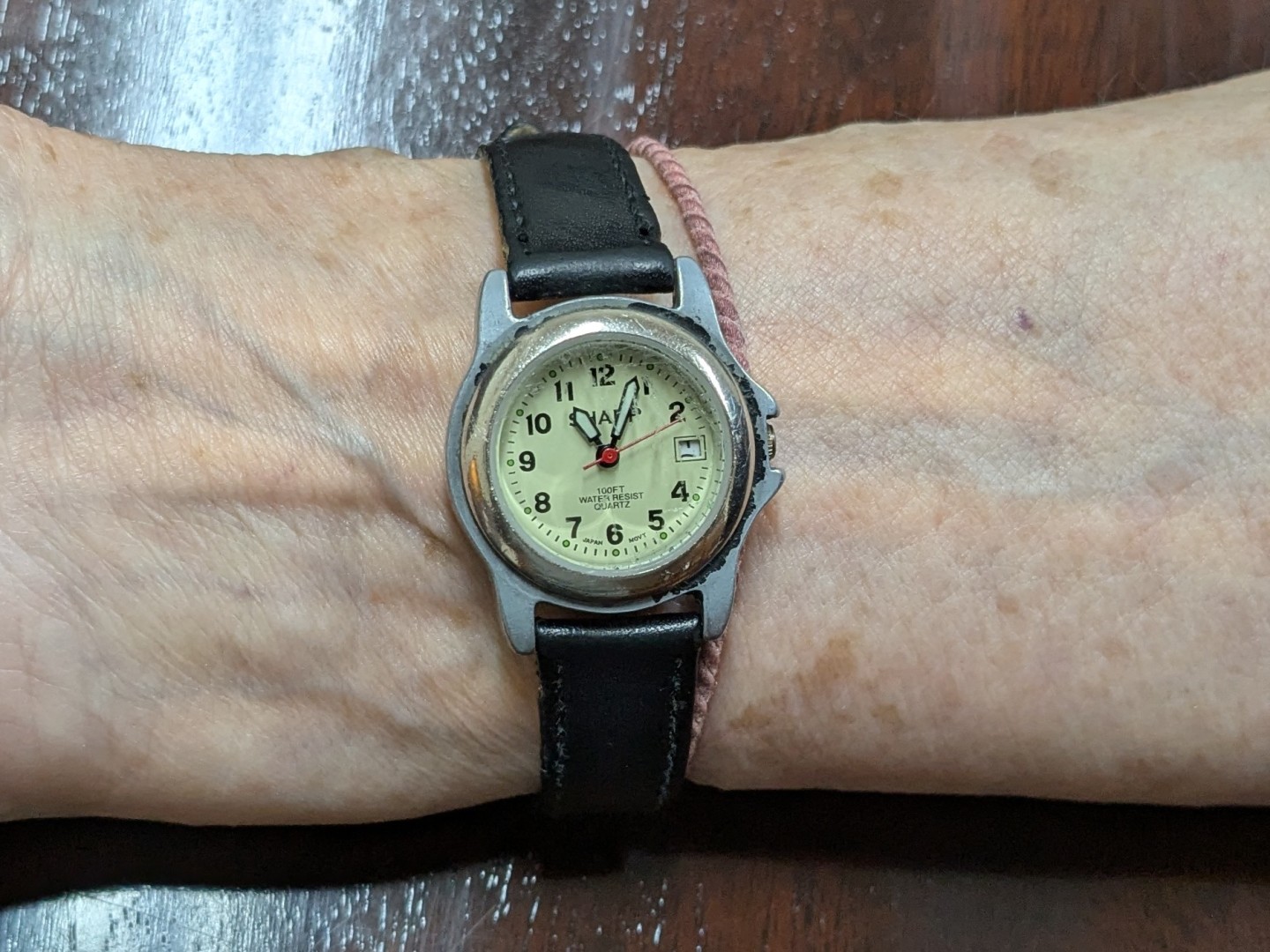 Simple small Timex purchased in about 2024. Husband wanted to gift me a fancy watch. I said no. The time is the same on a simple one.